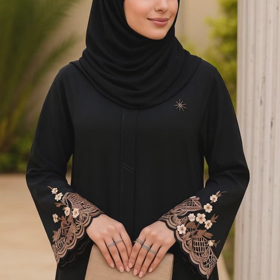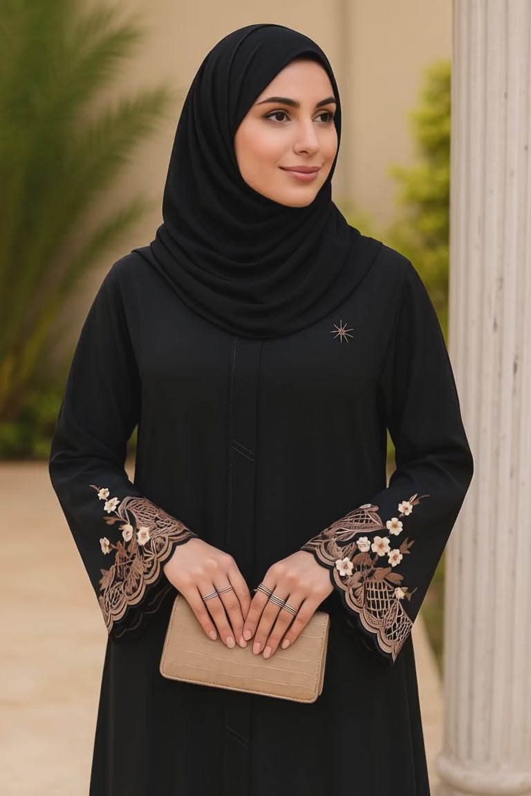 Elevate your style with the Black Chestnut Abaya - a perfect blend of modesty and elegance. This stunning abaya showcases intricate cutwork on its sleeves, adding a touch of sophistication. Its lightweight georgette fabric offers a cool and comfortable feel, while the modest design ensures great coverage. Stay cool in warm weather with its loose silhouette and long sleeves. Feel confident and beautiful in this exquisite abaya, with its flattering cut and delicate cutwork. Transition effortlessly from day to night by pairing it with heels and jewelry for a polished look. A must-have for any modest fashionista, this timeless abaya combines style, comfort, and coverage, making it a versatile addition to your wardrobe.