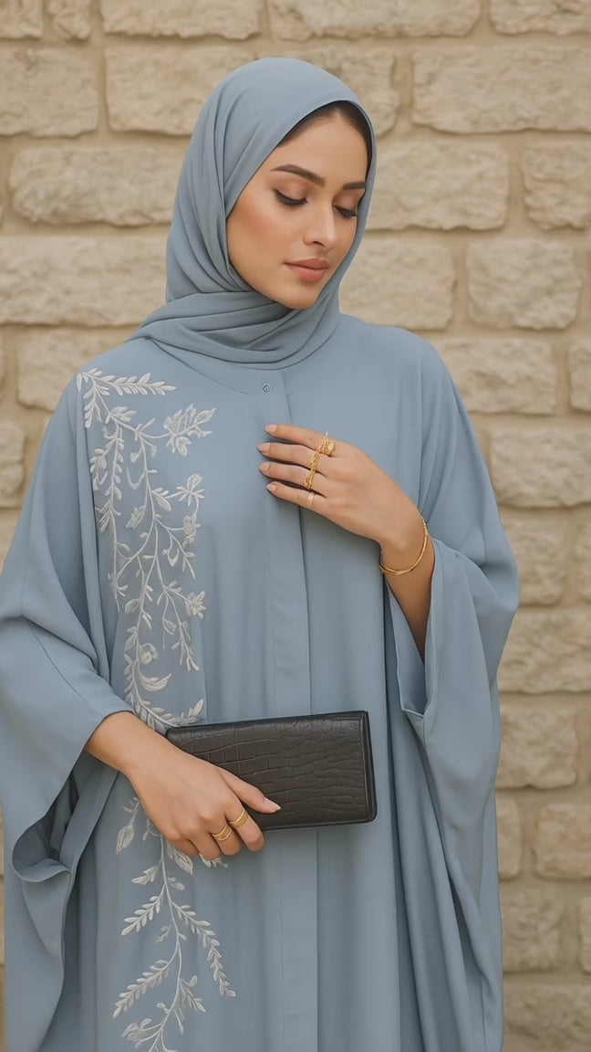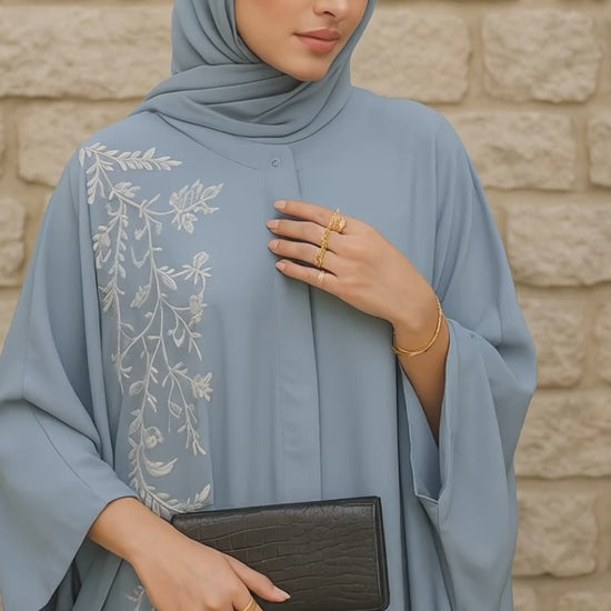 Introducing our Sky Blue Embroidered Poncho Abaya, a serene and elegant piece that effortlessly combines comfort, style, and sophistication. Crafted in a soothing sky blue hue, this abaya embodies a sense of tranquility and grace, making it a versatile addition to your wardrobe for both everyday wear and special occasions. The poncho-style design offers a relaxed, flowing silhouette that provides both comfort and elegance, allowing you to move freely while maintaining a polished look. With intricate embroidery along the neckline and sleeves, this abaya boasts delicate patterns that add a touch of artistry without overpowering the overall design. Made from high-quality, breathable fabric, this abaya ensures all-day comfort, keeping you cool and stylish in warmer climates. Its loose fit provides a modest, flattering look, while the refined details add a modern touch to a timeless classic. Key Features: A soft sky blue color for a calm, feminine aesthetic An elegant poncho-style design for a relaxed, flattering fit Delicate embroidery.