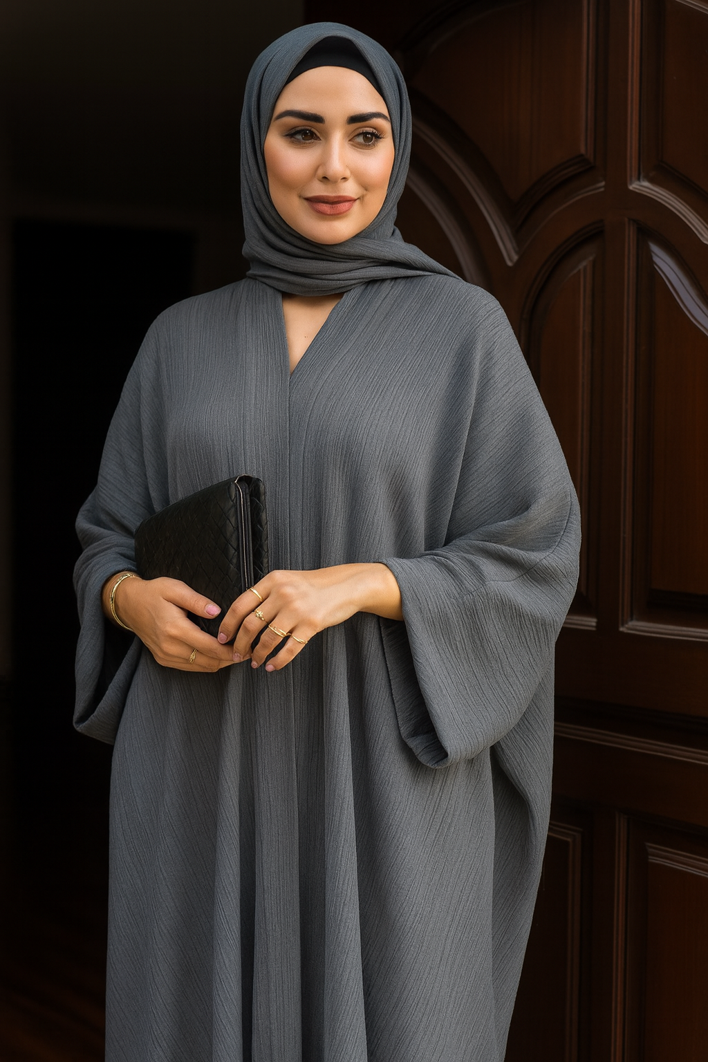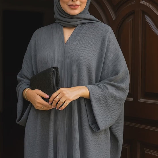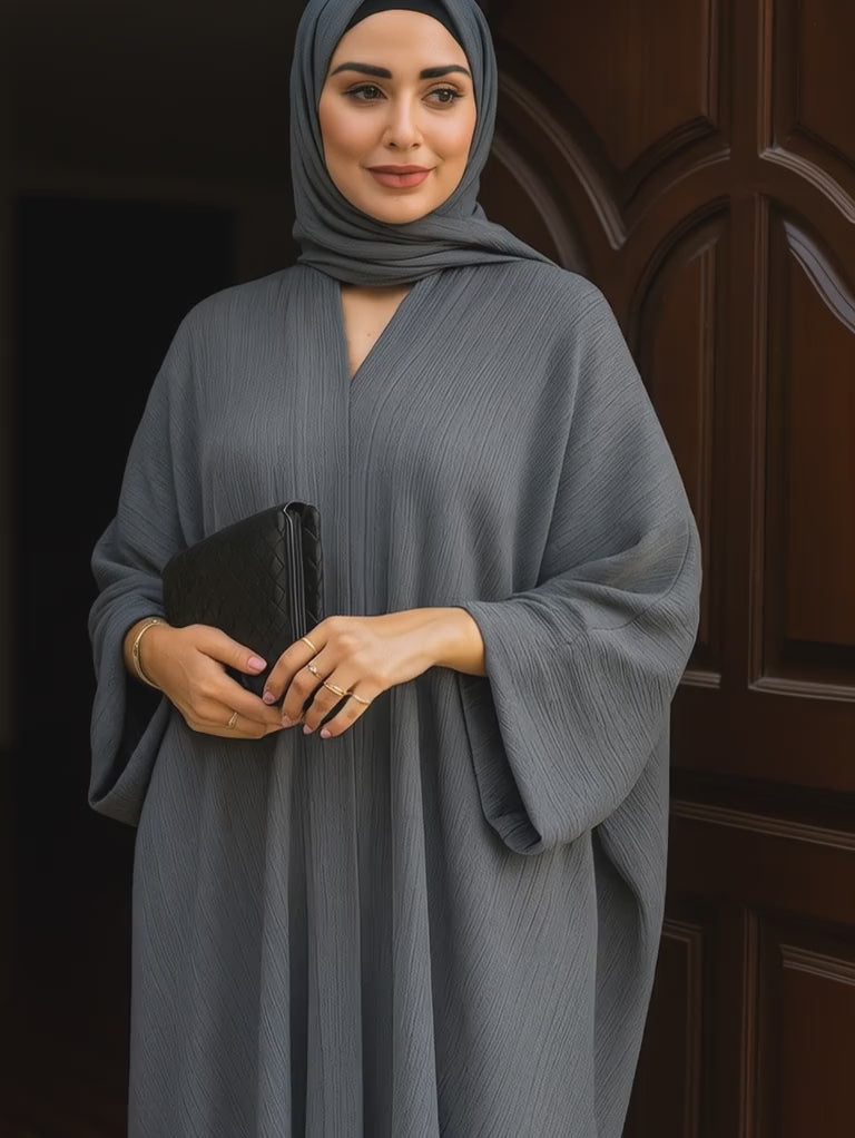 This elegant poncho-style abaya is crafted from premium imported crinkle fabric, offering a graceful drape and natural flow. Its loose fit provides effortless comfort while maintaining a sophisticated silhouette. The minimalistic design makes it versatile—perfect for both casual wear and formal occasions. The textured crinkle fabric adds depth and style, making it a timeless piece in any modest wardrobe.