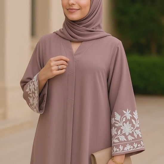 Elegant lilac abaya crafted from imported Korean breathable fabric, featuring delicate white embroidery on the sleeves. Perfect for any occasion — lightweight, flowy, and comfortable. Please note: colour may slightly vary due to camera and lighting.