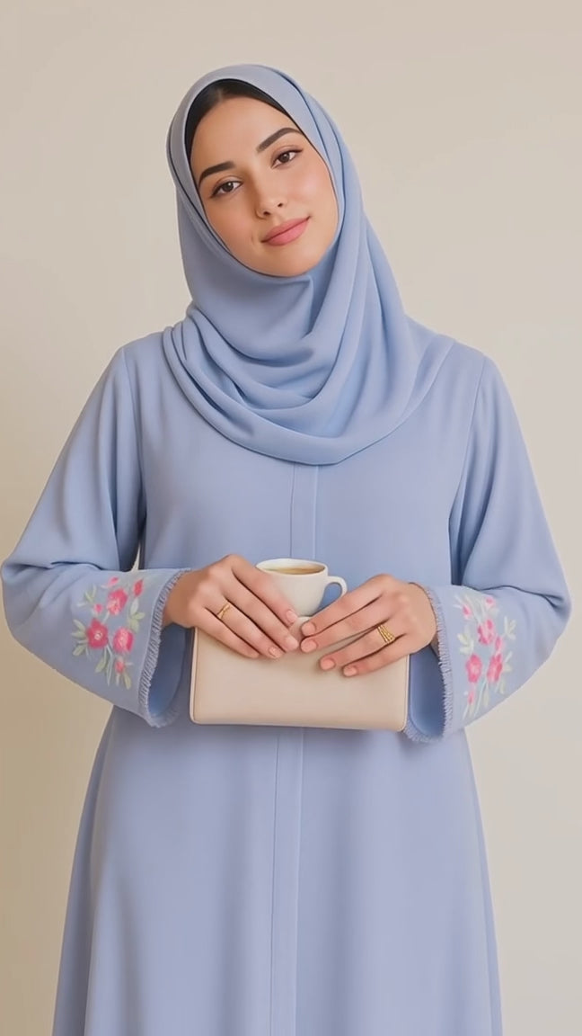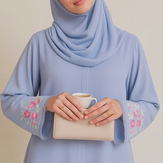 Our blue embroidered Abaya features a stunning front open style, crafted from non-slippery breathable fabric that ensures comfort and modesty. The intricate embroidery adds a touch of sophistication, making it perfect for formal events or everyday wear.